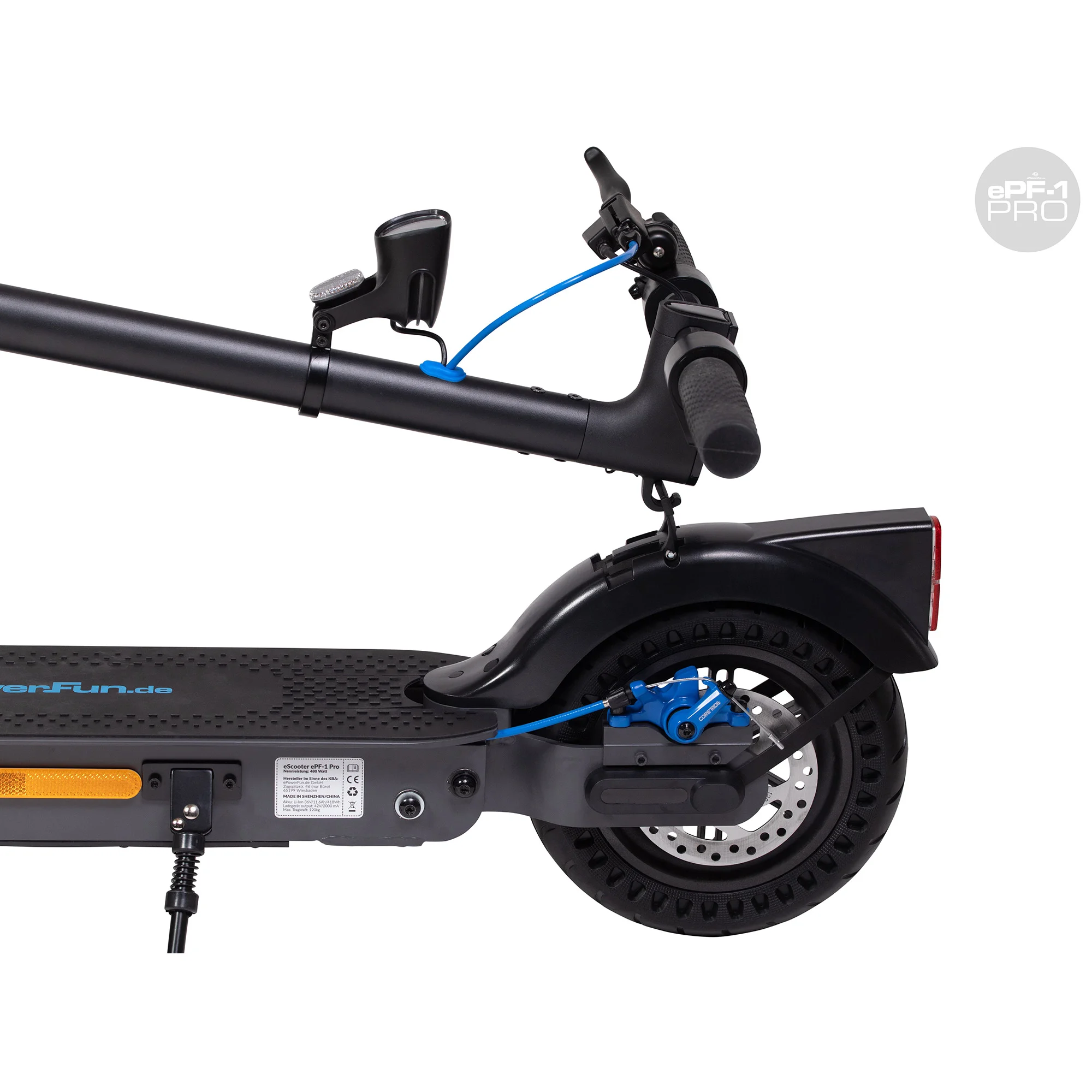 • 2) Die 10“ Luftkammerreifen. Wir haben EXTREM viele Tests mit Luftkammerreifen der verschiedensten Herstellern gemacht. Wir erzielten Reichweitenunterschiede von bis zu 5KM, obwohl es sich immer um 10“ Luftkammerreifen handelte. Wir haben herausgefunden, daß nicht nur die Gummimischung sondern auch die Reifenform einen Einfluss hat. Daher sprechen wir beim ePF-1 PRO auch jetzt von Eco-Luftkammerreifen, einfach weil wir durch die Optimierung unserer Reifen soviel Reichweite gewonnen haben.