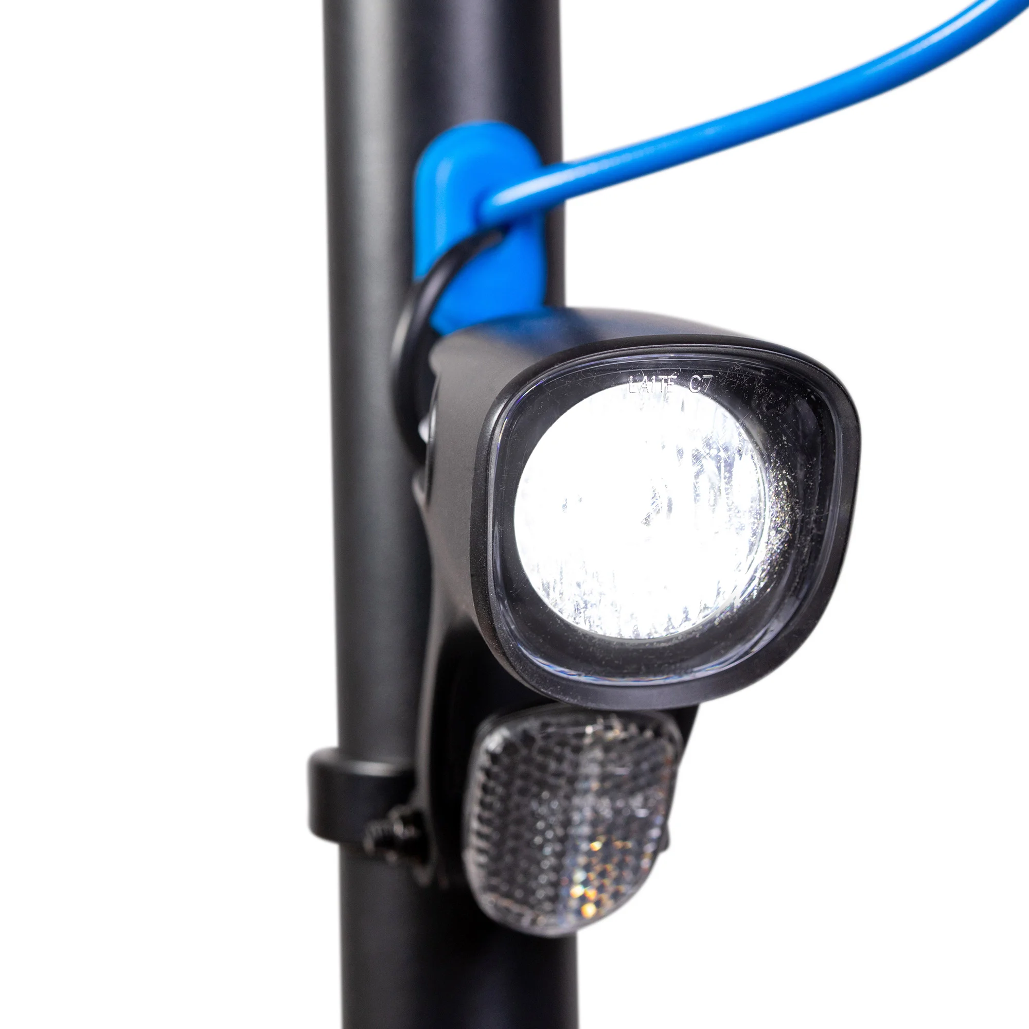 • Beleuchtung: Front- (mit äusserem Leuchtring) und Heckleuchte, StVZO-konform. Ist ein- und ausschaltbar. Benötigt keine Batterien, wird vom Fahrakku gespeist