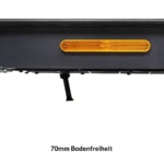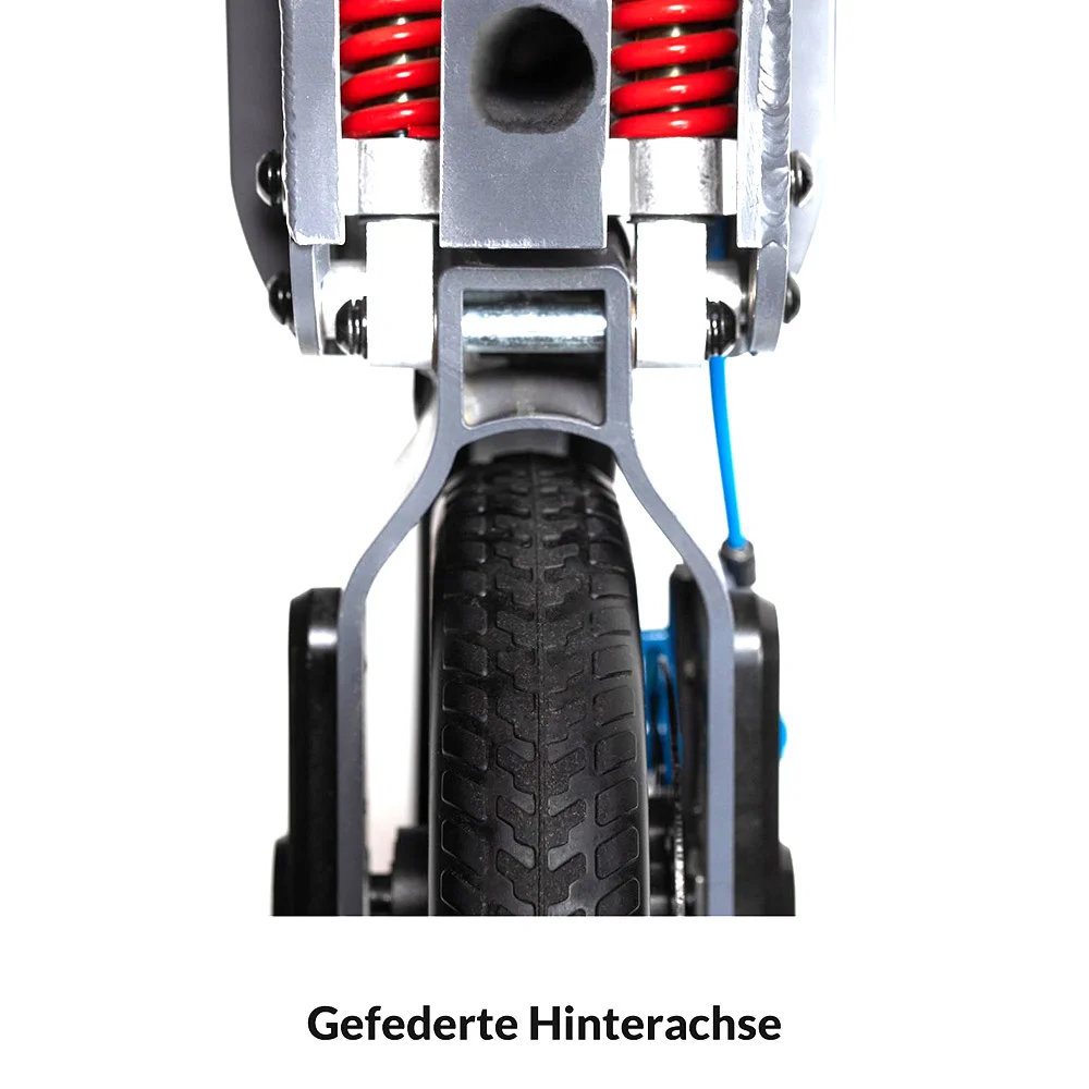 • Zwei (2!) Federelemente, einstellbar, an der Hinterachse – für mehr Fahrkomfort. Viele E-Scooter sind ungefedert.
