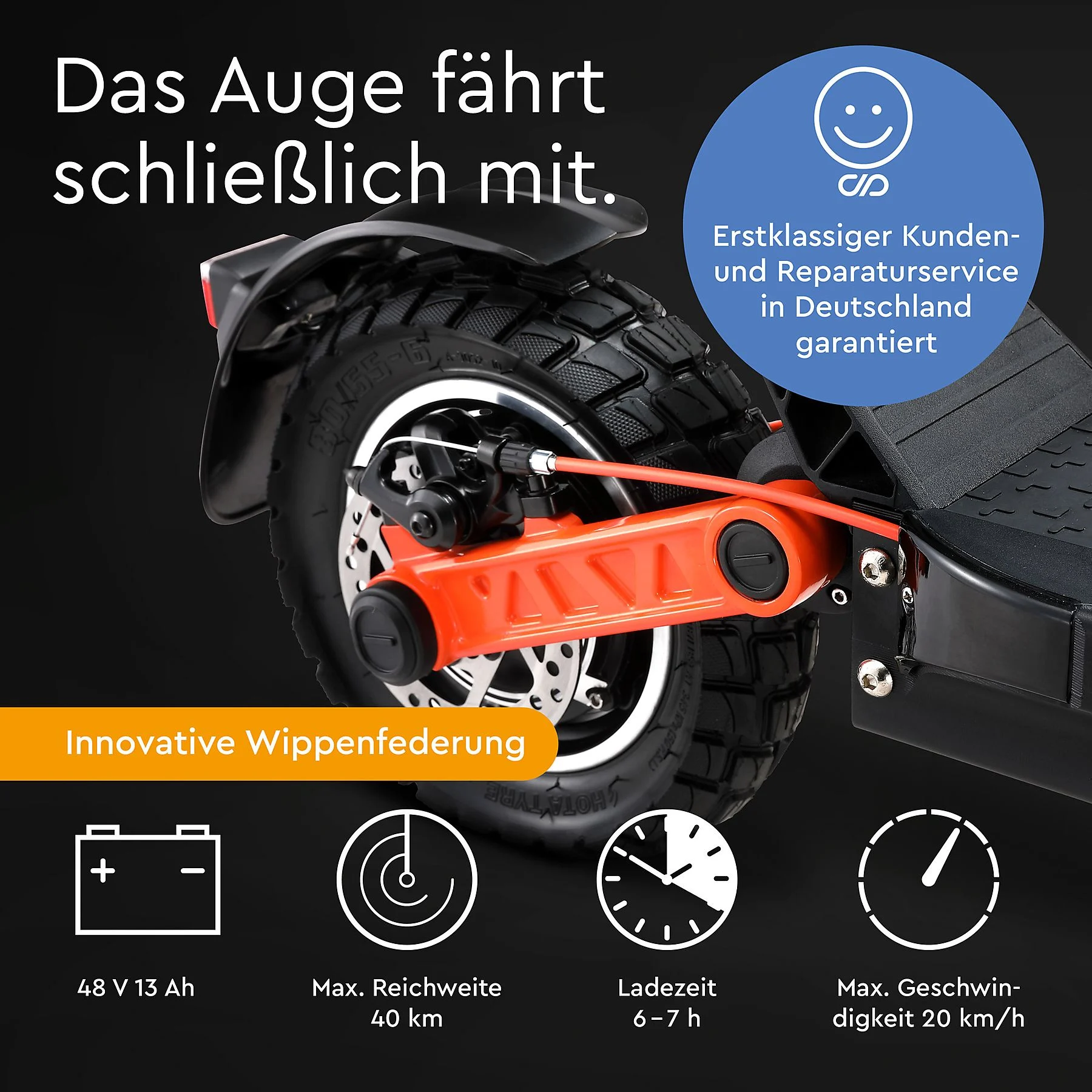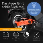 Die beeindruckenden technischen Daten und das robuste, exklusive Design machen diesen Elektroroller zum perfekten Begleiter für Abenteuer in der Stadt und auf unbefestigten Wegen.