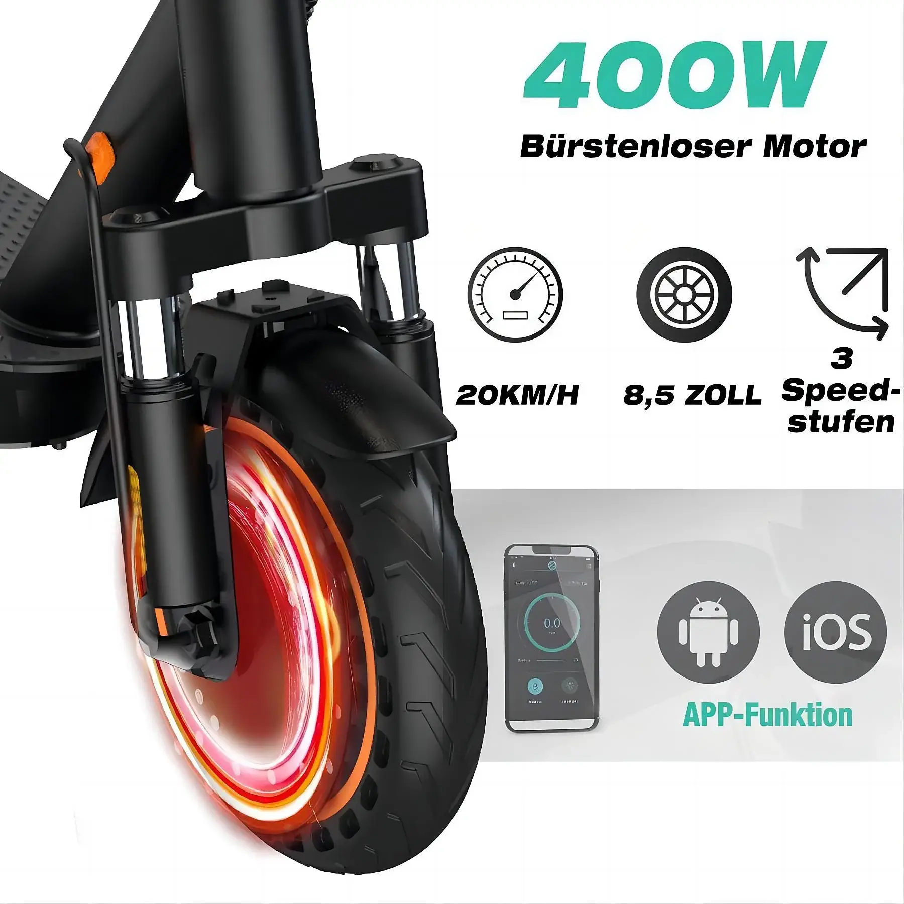 Laden Sie die kostenlose APP (iOS & Android) herunter und verbinden Sie den E-Scooter über Bluetooth. Der Elektroroller verfügt über ein Bluetooth-System, eine Geschwindigkeitseinstellung, eine Kilometer- und Zeiterfassung sowie einen E-Scooter-Selbsttest.