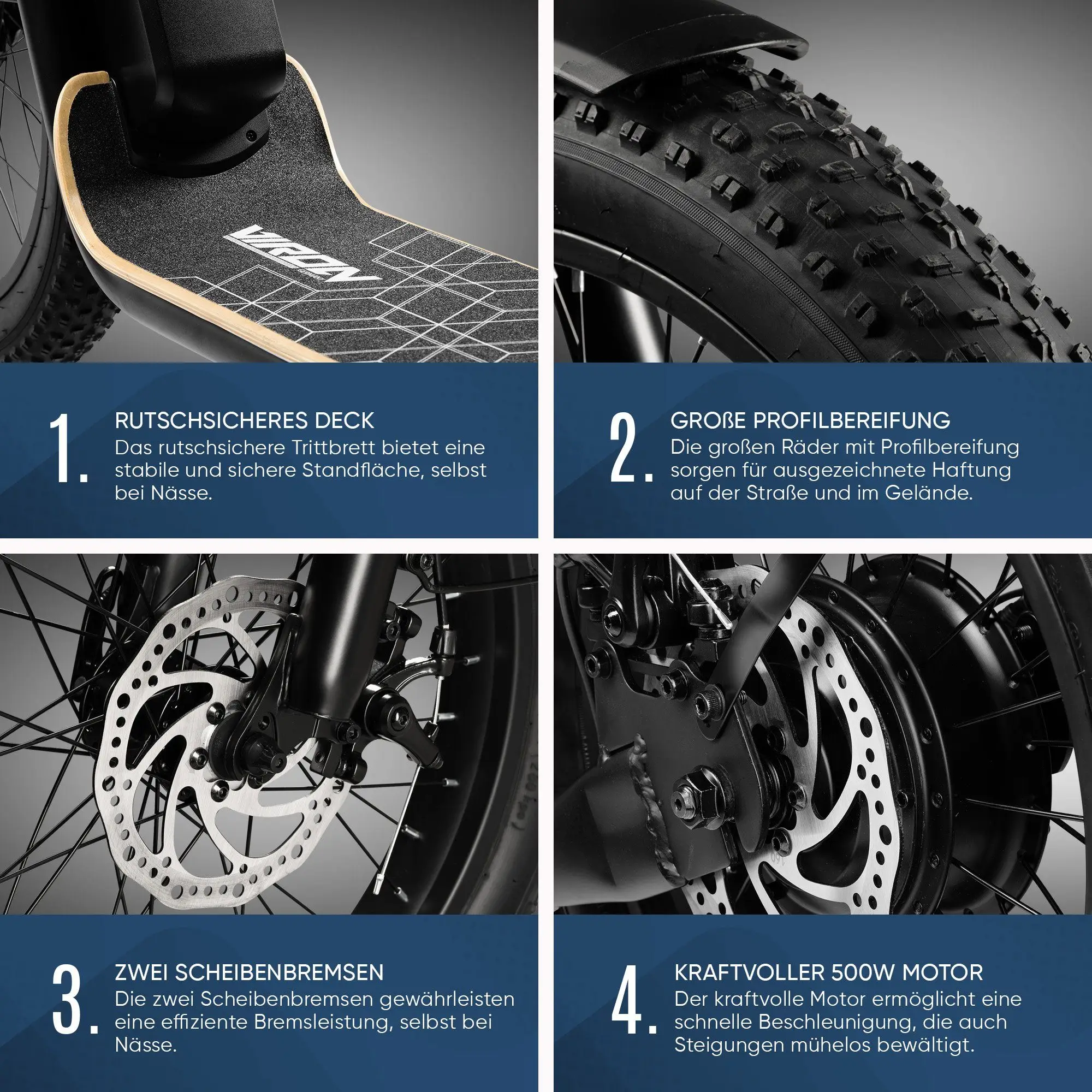 Ö : Der VIRON XI-1200-S verfügt über einen stabilen Rahmen und große Räder, die eine erstklassige Traktion und Stabilität sowohl auf befestigten Straßen als auch auf unebenem Gelände gewährleisten. Egal, ob Sie durch die Stadt fahren oder abseits der ausgetretenen Pfade erkunden möchten, dieser E-Scooter meistert jede Herausforderung.